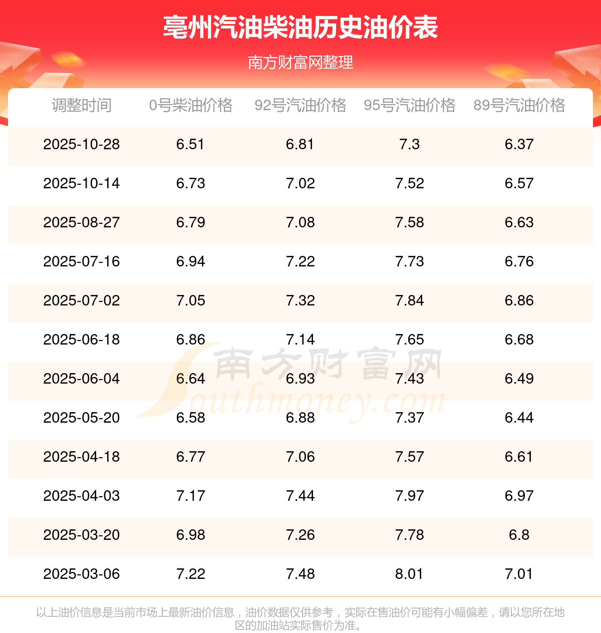 汽油、柴油11月4日每升的价格为10月28日调整后的价格,具体油价为:92号汽油6.81元;95号汽油7.3元;89号汽油6.37元;0号柴油6.51元。下一轮油价调整时间11月10日24时,距离现在还有6.96天。