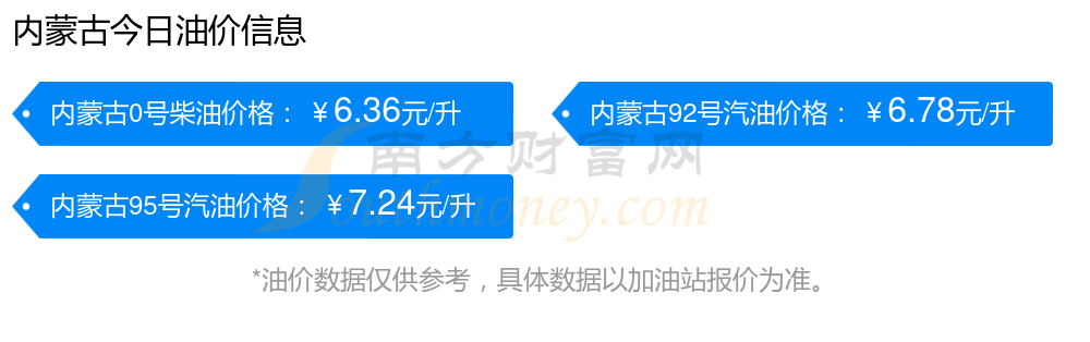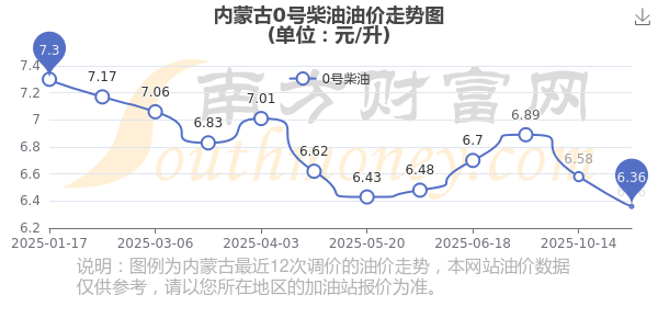 11月4日,内蒙古0号柴油的价格是6.36元每升,本次的调整时间为10月28日,对比上次的调整下降了0.22元,下降3.343%,下次调整时间为11月10日24时,还有6.96天。