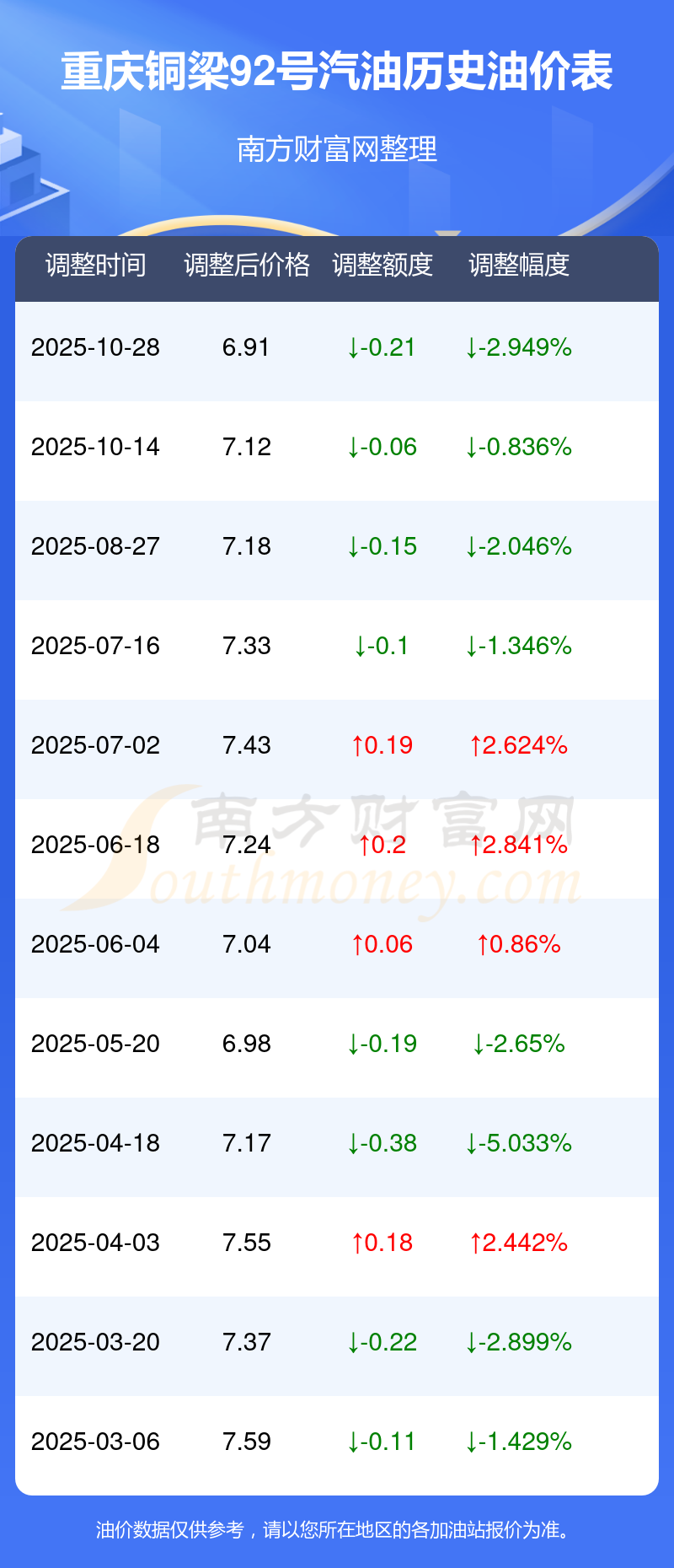 2025年92号汽油价格调整一览表