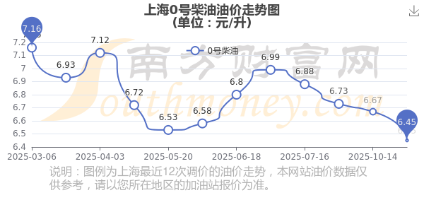 11月4日,上海0号柴油的价格是6.45元每升,本次的调整时间为10月28日,对比上次的调整下调了0.22元,下调3.298%,下次调整时间为11月10日24时,还有6.96天。