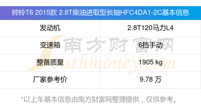 帅铃T6 2015款 2.8T柴油进取型长轴HFC4DA1-2C动力上配备的是一台2.8T120马力L4涡轮增压发动机,匹配的是6挡手动挡变速箱,燃料形式为柴油,常规整备质量1905kg,厂家参考价9.78万元。