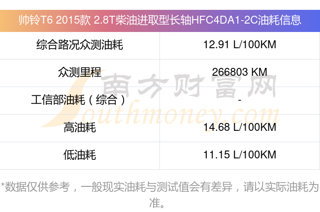 根据多位车主实测得出数据,该车型低油耗为11.15L/100km,高油耗为14.68L/100km,综合路况众测油耗为12.91L/100km,工信部综合油耗为-L/100km。