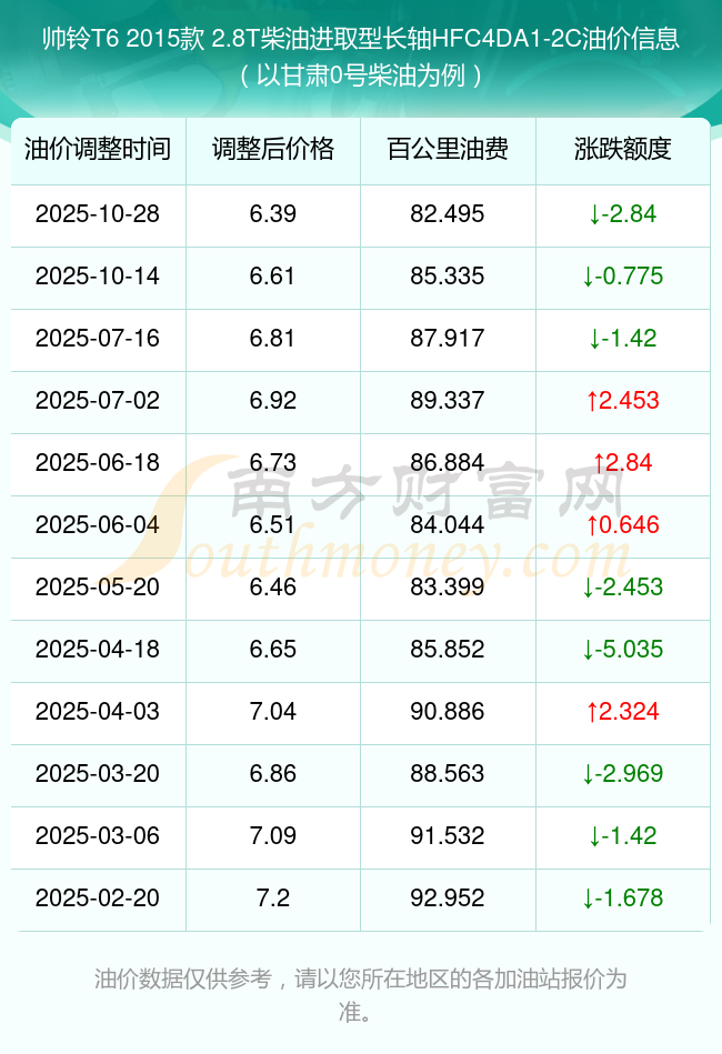 依照10月28日0号柴油最新调整价格6.39元/升来计算(以甘肃为例),该车型百公里的平均油费是82.495元,依照上一轮10月14日调整价格6.61元/升来计算,百公里的平均油费是85.335元,对比上一轮少花2.84元,下一轮的油价调整时间11月10日24时。