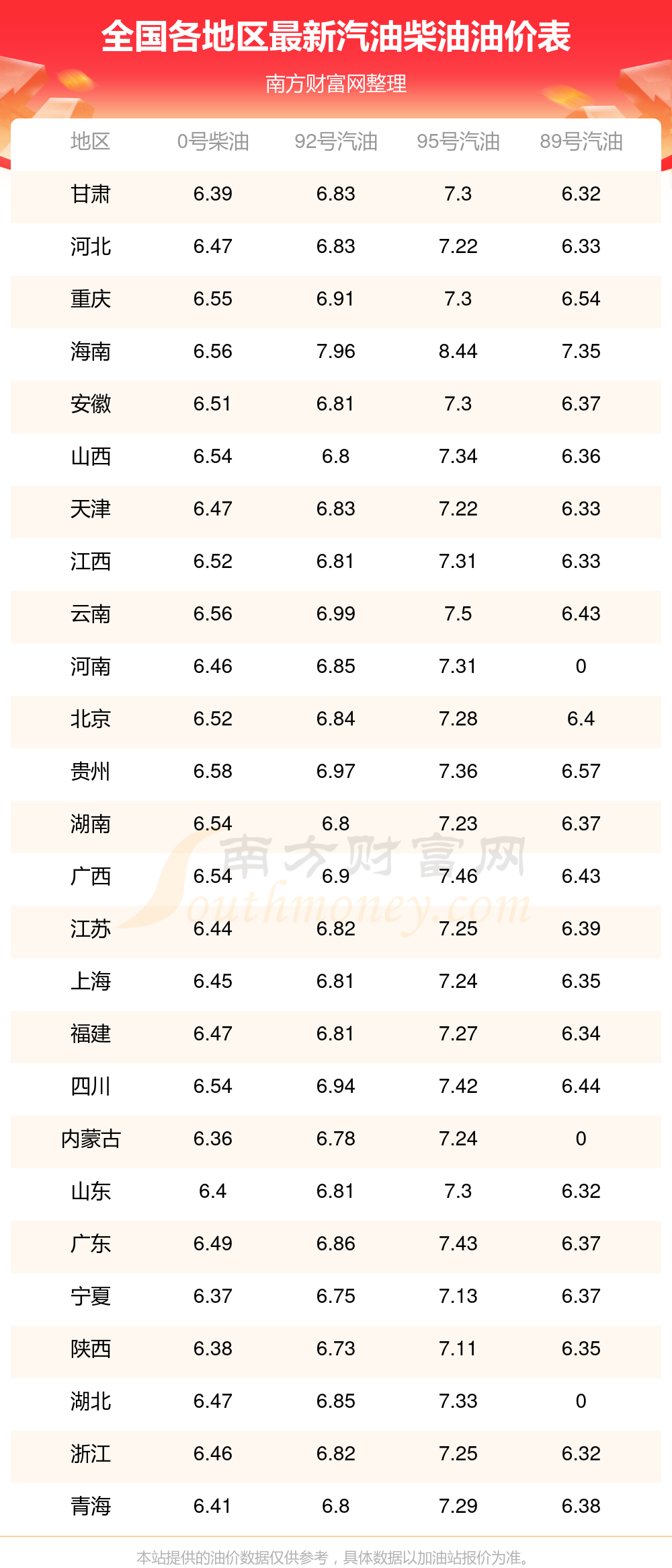 油价数据仅供参考,请以您所在地区的各加油站报价为准。