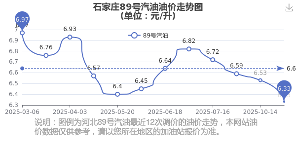 油价调整最新消息:石家庄汽油、柴油11月4日每升的价格为(油价调整时间是10月28日):92号汽油6.83元;95号汽油7.22元;89号汽油6.33元;0号柴油6.47元。石家庄下一轮油价调整时间11月10日24时,距离现在还有6.96天。