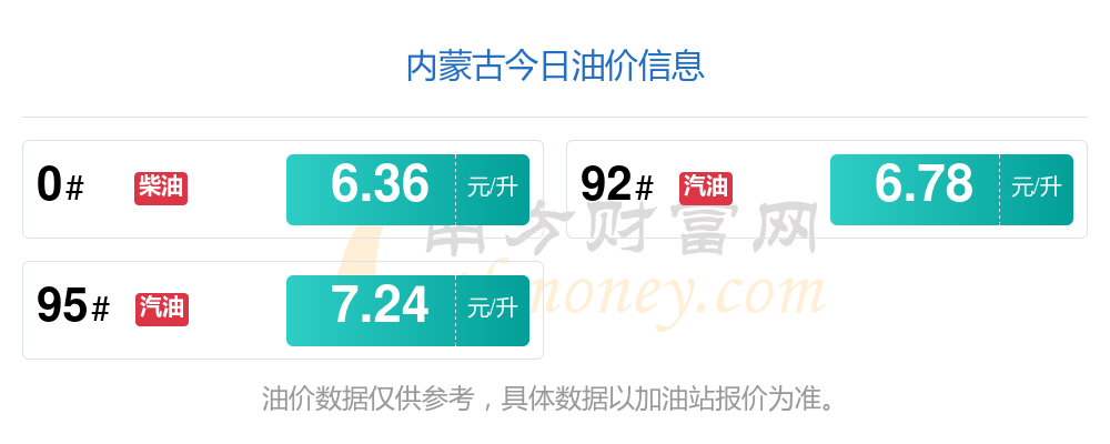 油价调整最新消息:11月4日内蒙古汽油、柴油每升的最新价格:92号汽油6.78元,下降了0.21元;95号汽油7.24元,下降了0.22元;0号柴油为6.36元,下降了0.22元,本次油价调整时间是10月28日。下一轮油价调整时间11月10日24时。