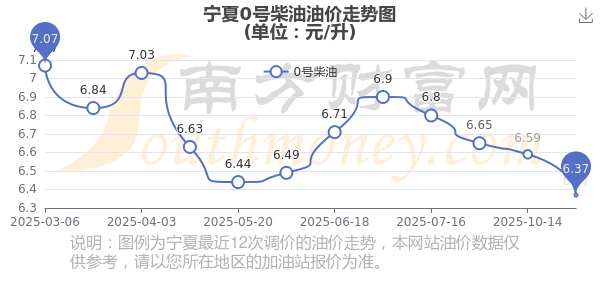 11月4日,宁夏0号柴油的价格是6.37元每升,本次的调整时间为10月28日,对比上次的调整下跌了0.22元,下跌3.338%,11月10日24时为下一轮油价调整时间,还有6.96天。