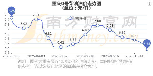11月4日,重庆0号柴油的价格是6.55元每升,本次的调整时间为10月28日,对比上次的调整减了0.22元,减3.25%,下次调整时间为11月10日24时,还有6.96天。