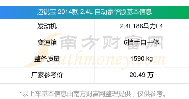 迈锐宝 2014款 2.4L 自动豪华版动力上搭载的是一台2.4L186马力L4自然吸气发动机,匹配6挡手自一体自动档变速箱,燃料形式为汽油,常规整备质量1590kg,厂家参考价20.49万元。