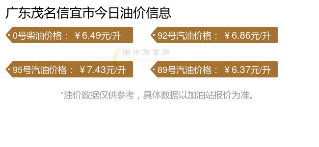 11月4日,广东茂名信宜市汽油、柴油每升的价格是多少?本次油价调整时间是10月28日,92号汽油为6.86元,降了0.21元,降幅达2.97%;95号汽油为7.43元,降了0.23元,降幅达3%;89号汽油为6.37元,降了0.2元,降幅达3.04%;0号柴油为6.49元,降了0.21元,降幅达3.13%。