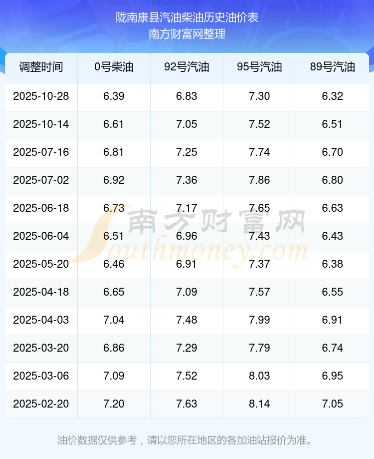油价调整最新消息:下一轮油价调整时间11月10日24时。11月4日,陇南康县汽油、柴油每升的价格为10月28日调整后的价格,具体为:92号汽油为6.83元,减了0.22元,减幅达3.12%;95号汽油为7.3元,减了0.22元,减幅达2.93%;89号汽油为6.32元,减了0.19元,减幅达2.92%;0号柴油为6.39元,减了0.22元,减幅达3.33%。
