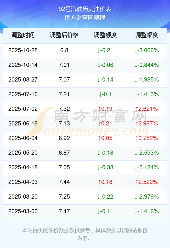 汽油、柴油11月4日每升的价格为(油价调整时间是10月28日):92号汽油6.8元;95号汽油7.23元;89号汽油6.37元;0号柴油6.54元。下一轮油价调整时间11月10日24时,距离现在还有6.96天。