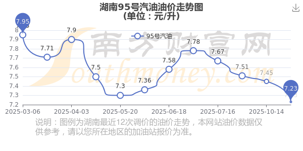 11月4日,湖南95号汽油的价格是7.23元每升,本次的调整时间为10月28日,对比上次的调整减了0.22元,减3.006%,11月10日24时为下一轮油价调整时间,还有6.96天。