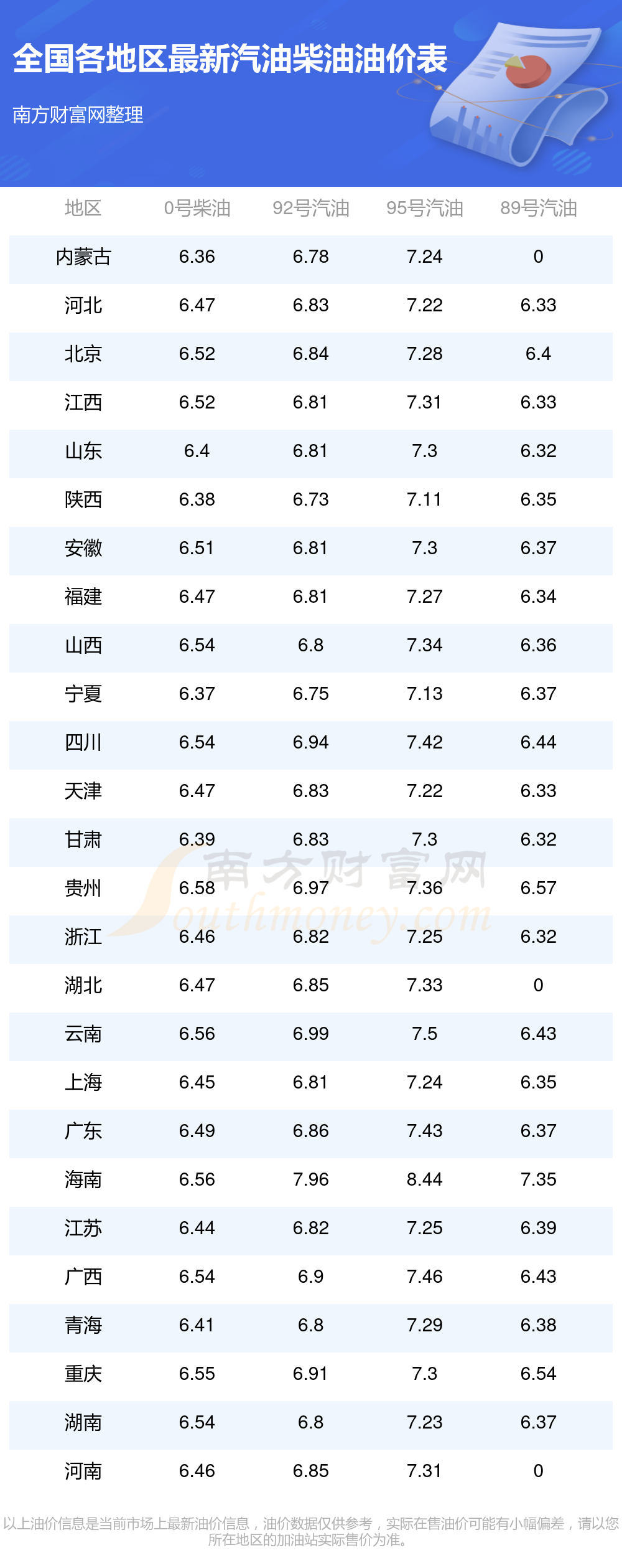 油价数据仅供参考,请以您所在地区的各加油站报价为准。