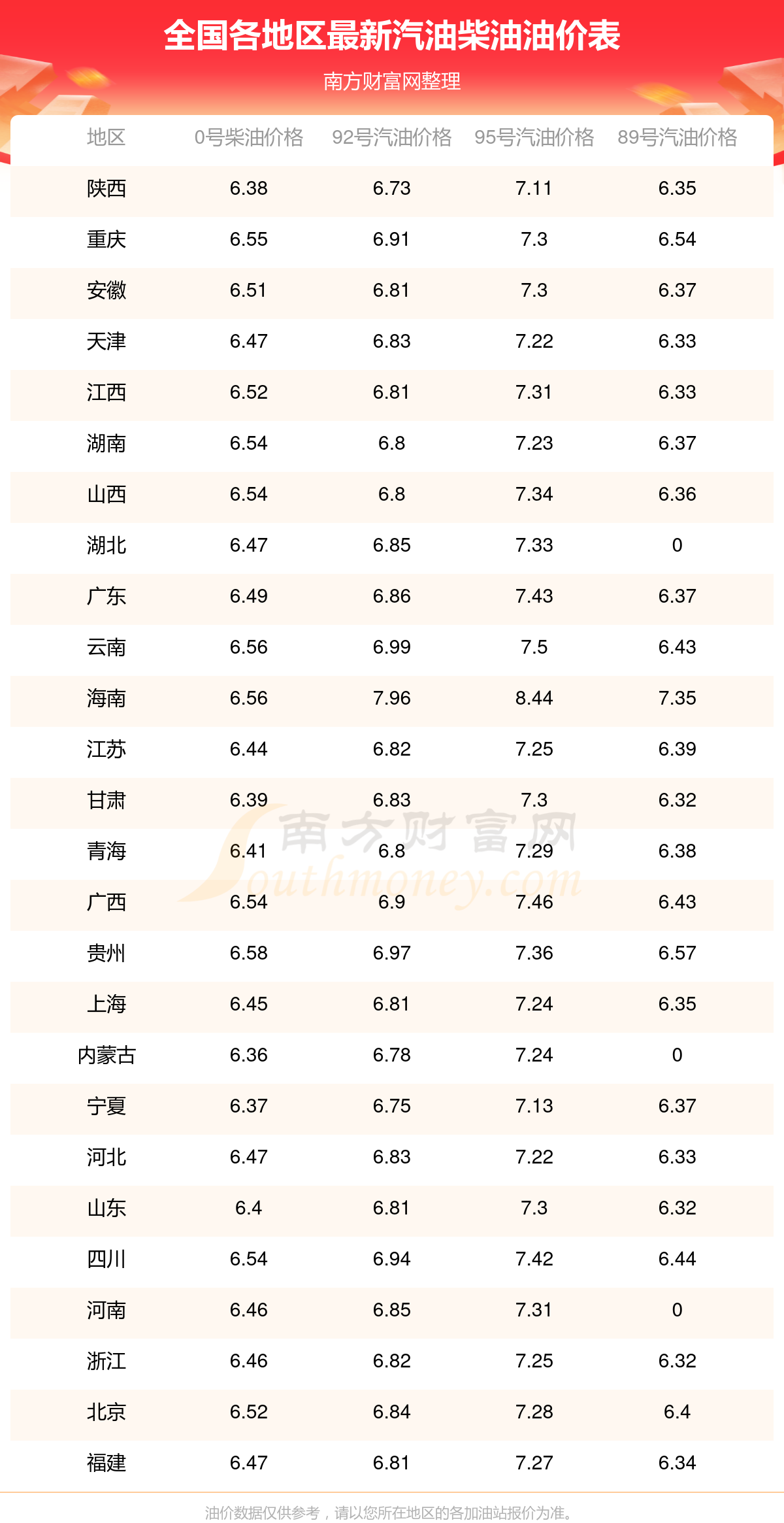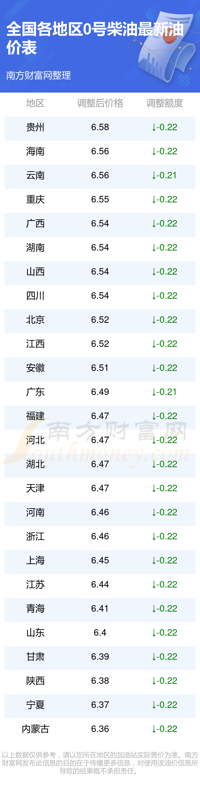 油价数据仅供参考,请以您所在地区的加油站报价为准。南方财富网发布此信息的目的在于传播更多信息,对使用该油价信息所导致的结果概不承担任何责任。