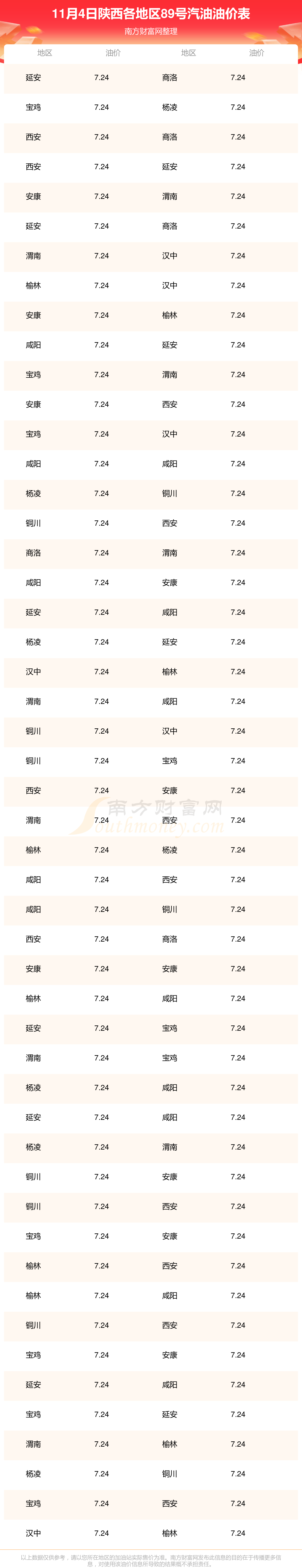 2025年11月4日陕西89号汽油最新价格一览表