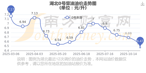 11月4日,湖北0号柴油的价格是6.47元每升,本次的调整时间为10月28日,对比上次的调整降了0.22元,降3.288%,下次调整时间为11月10日24时,还有6.96天。