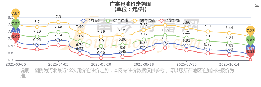 11月4日广宗县汽油、柴油每升价格:距离最近的油价调整时间是10月28日,92号汽油为6.83元,下跌了0.21元,下跌幅达2.98%;95号汽油为7.22元,下跌了0.22元,下跌幅达2.96%;89号汽油为6.33元,下跌了0.2元,下跌幅达3.06%;0号柴油为6.47元,下跌了0.22元,下跌幅达3.29%。