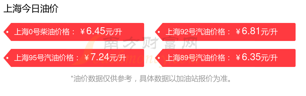 11月4日,上海汽油、柴油每升最新价格为:调整时间为10月28日,92号汽油为6.81元,下调了0.21元,下调幅达2.99%;95号汽油为7.24元,下调了0.23元,下调幅达3.08%;89号汽油为6.35元,下调了0.2元,下调幅达3.05%;0号柴油为6.45元,下调了0.22元,下调幅达3.3%。