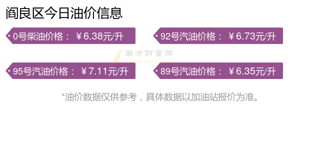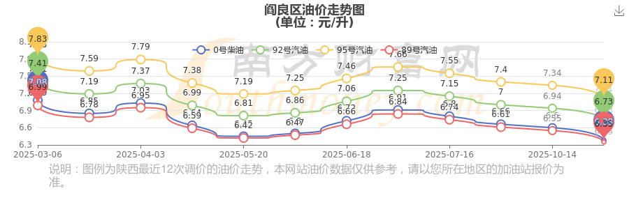 11月4日阎良区今日汽油价格如下:92号汽油6.73元;95号汽油7.11元;89号汽油6.35元;0号柴油6.38元(该价格为10月28日调整后的价格)。