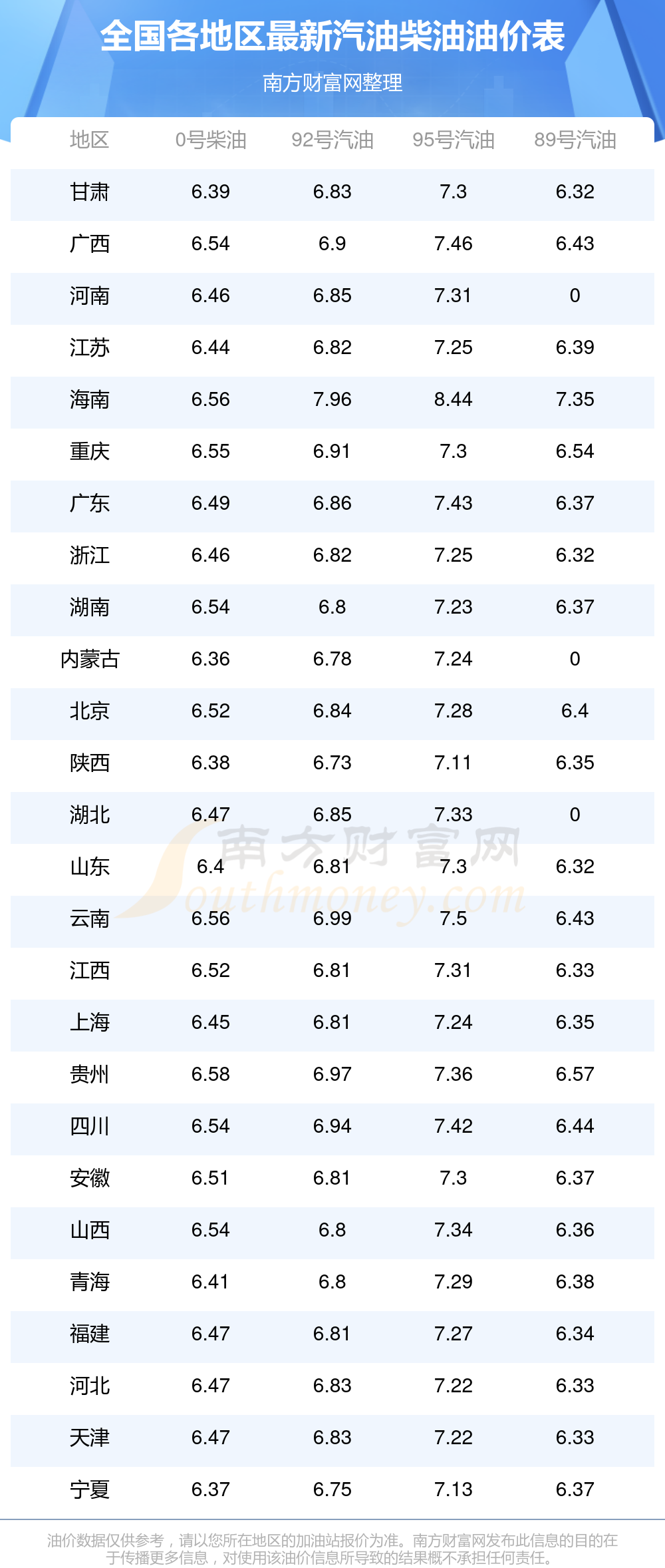 油价数据仅供参考,请以您所在地区的加油站报价为准。南方财富网发布此信息的目的在于传播更多信息,对使用该油价信息所导致的结果概不承担任何责任。