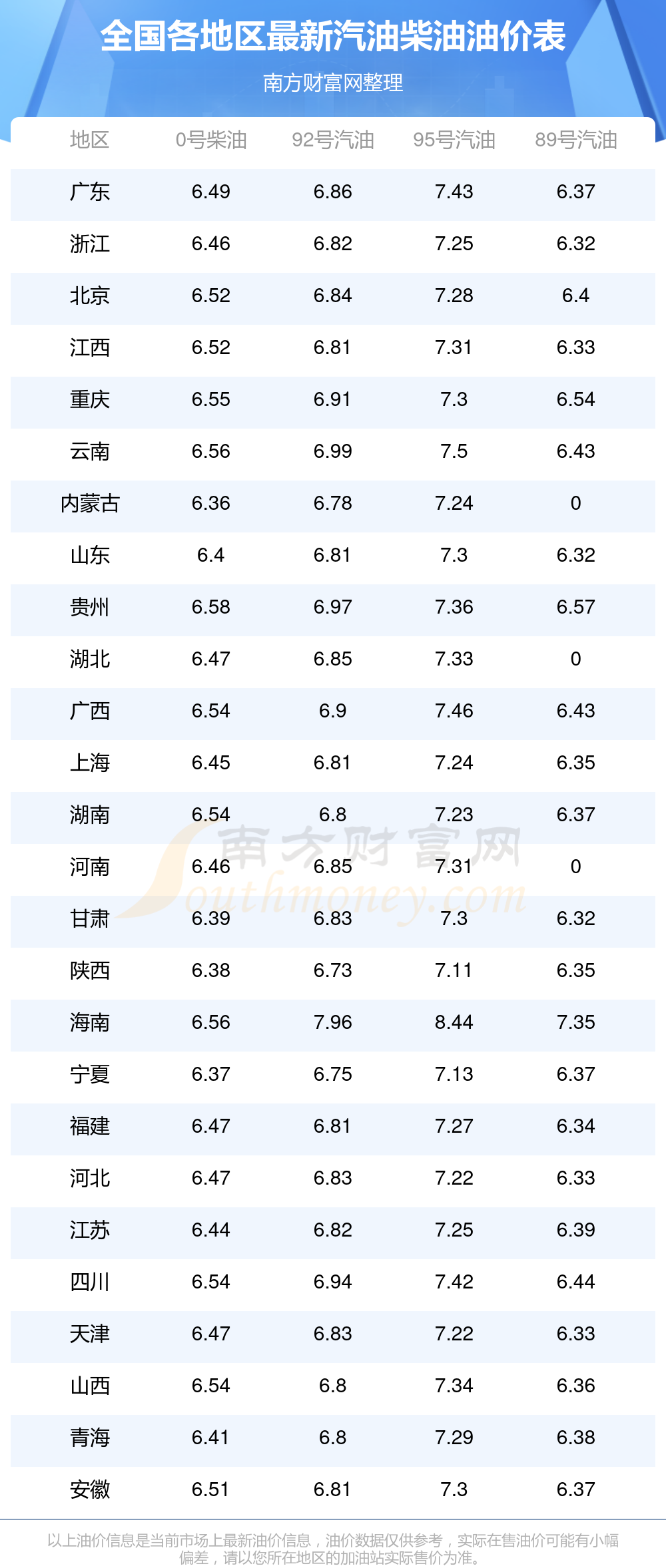 全国89号汽油平均价格为:6元每升,其中,最低为浙江,价格6.32元/升,最高为海南,价格7.35元/升。