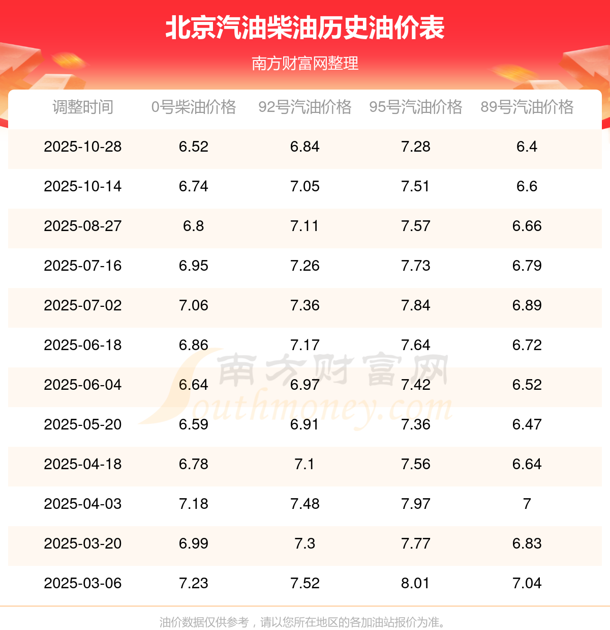 11月4日北京汽油柴油每升的价格为10月28日调整后的价格,具体如下:92号汽油6.84元;95号汽油7.28元;89号汽油6.4元;0号柴油6.52元。