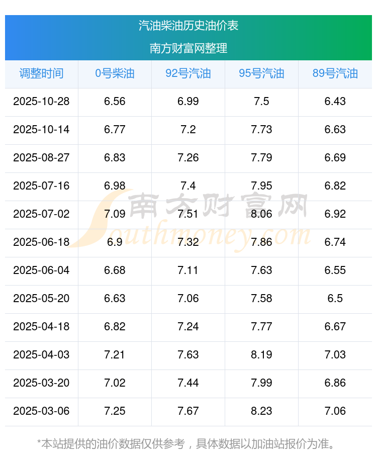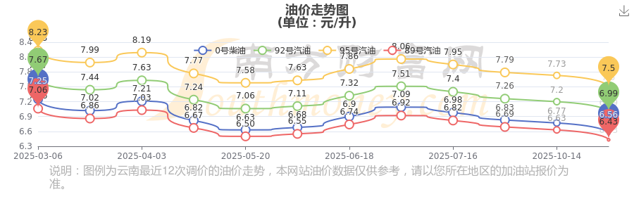 怒江92号汽油11月4日的最新价格为6.99元/升,调整时间为10月28日,相对上次调整下调了0.21元。下一轮油价调整时间11月10日24时,距离现在还有6.96天。