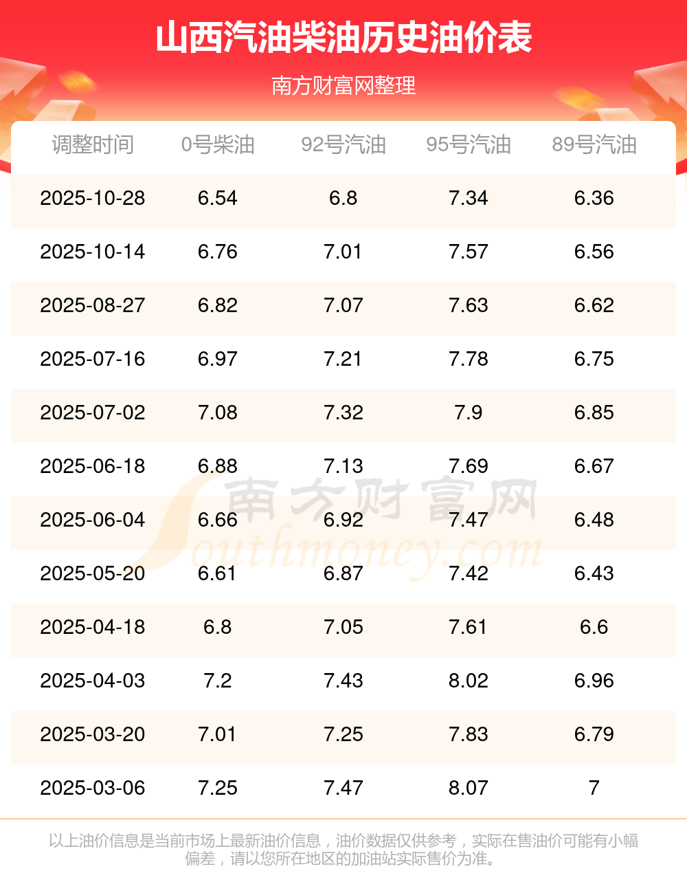11月4日,山西0号柴油的价格是6.54元每升,本次的调整时间为10月28日,对比上次的调整跌了0.22元,跌3.254%,11月10日24时为下一轮油价调整时间,还有6.96天。
