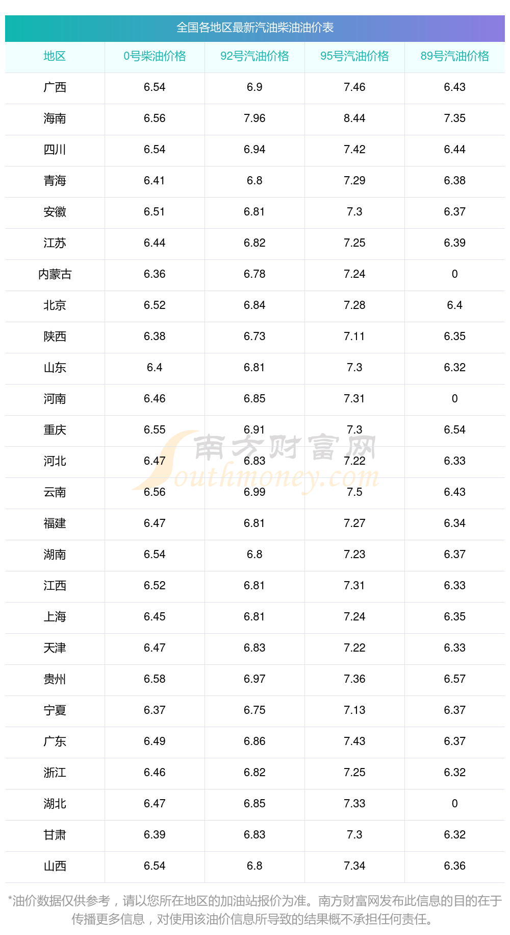 油价调整最新消息:油价最新调整时间为10月28日 ,全国92号汽油最新平均价格为:7元每升,其中,最高为海南,价格为7.96元/升,最低为陕西,价格为6.73元/升。全国95号汽油最新平均价格为:7元每升,其中,最高为海南,价格为8.44元/升,最低为陕西,价格为7.11元/升。全国0号柴油最新平均价格为:6元每升,其中,最高为贵州,价格为6.58元/升,最低为内蒙古,价格为6.36元/升。全国89号汽油最新平均价格为:6元每升,其中,最高为海南,价格为7.35元/升,最低为浙江,价格为6.32元/升。下一轮汽油价格调整时间11月10日24时,距离现在还有6.96天。