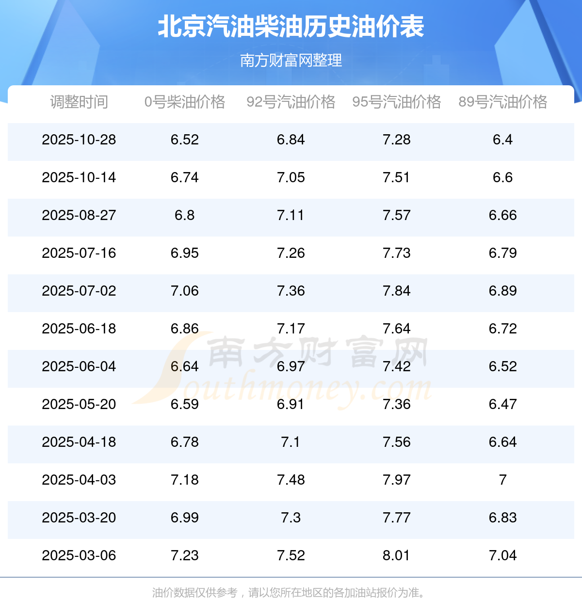 北京汽油、柴油11月4日价格多少钱一升?具体为:0号柴油为6.52元,下调了0.22元;95号汽油为7.28元;92号汽油为6.84元;89号汽油为6.4元,调整时间为10月28日。