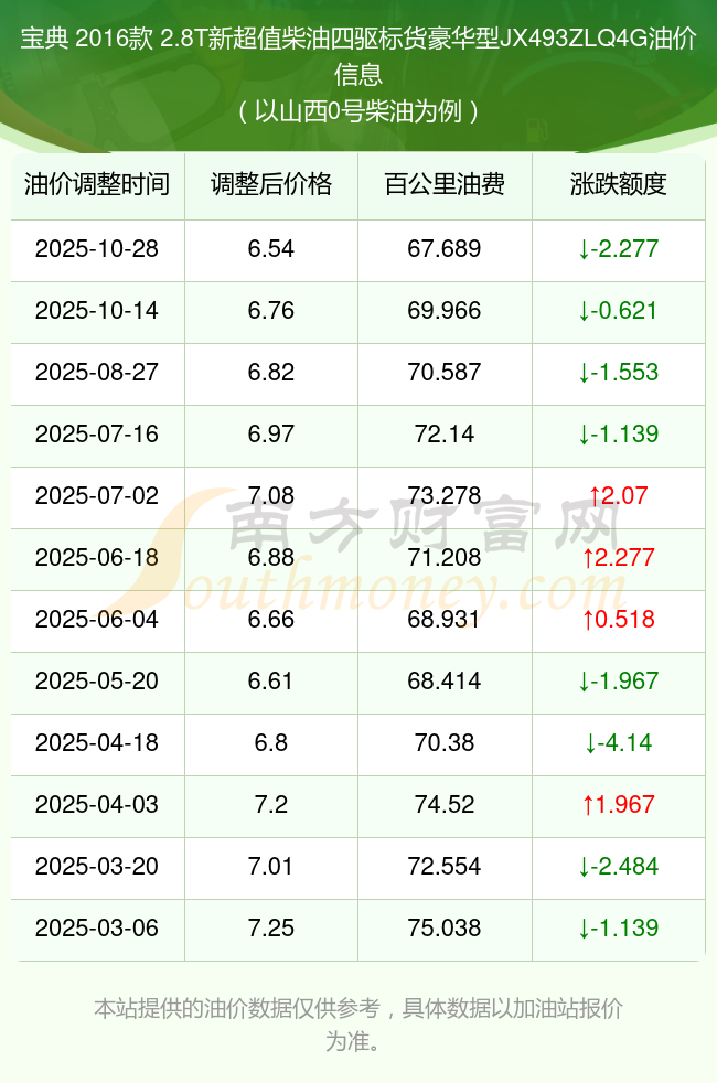 该车型目前采用的是2.8T109马力L4涡轮增压发动机,5挡手动挡的变速箱,按0号柴油当前最新价格6.54元/升来计算(以山西为例),平均油费为0.67689元每公里。厂家参考价为9.88万元。