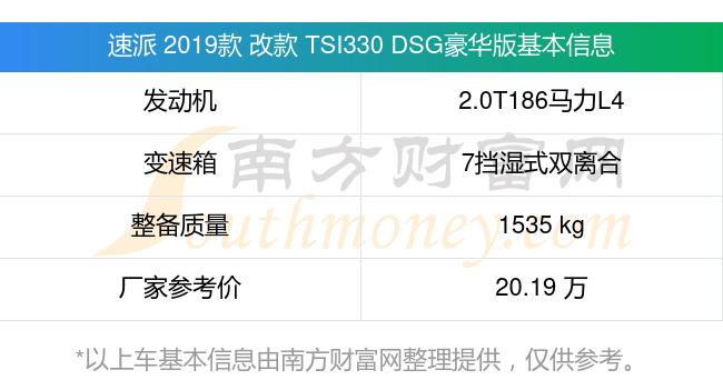 速派 2019款 改款 TSI330 DSG豪华版动力方面,搭载的是一台2.0T186马力L4涡轮增压发动机,匹配7挡湿式双离合自动档变速箱,燃料形式为汽油,常规整备质量1535kg,厂家参考价20.19万元。