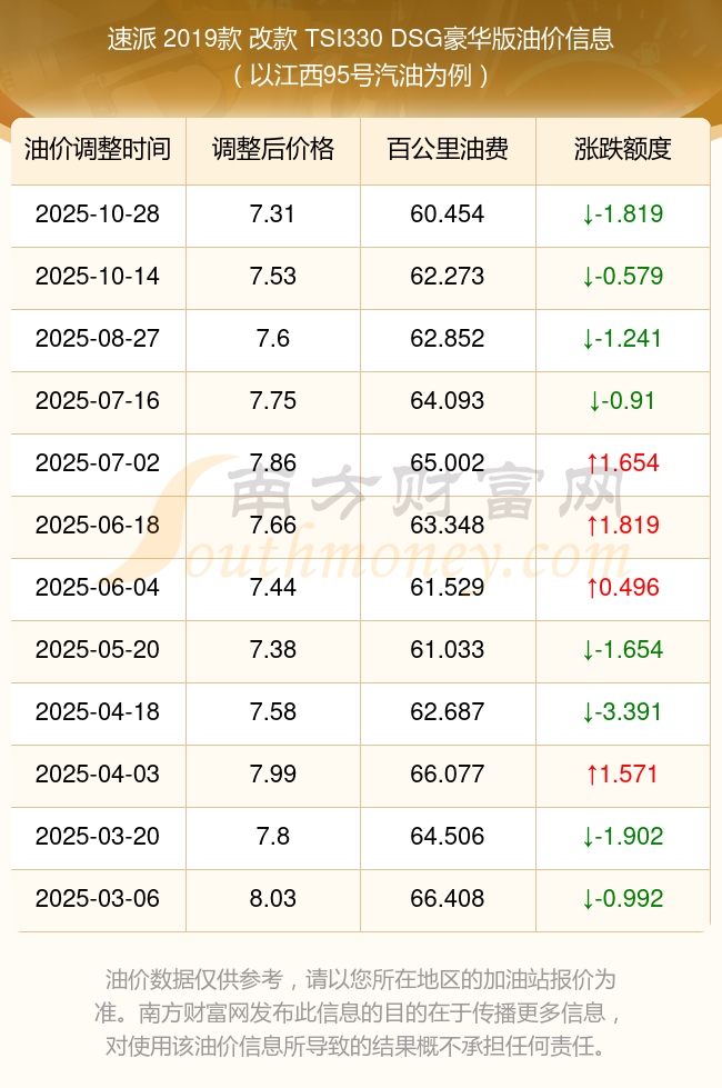 按照10月28日95号汽油最新调整价格7.31元/升来计算(以江西为例),该车型百公里平均油费为60.454元,按照上一轮10月14日调整价格7.53元/升来计算,百公里平均油费为62.273元,对比上一轮少花1.819元,下一轮油价调整时间为11月10日24时。