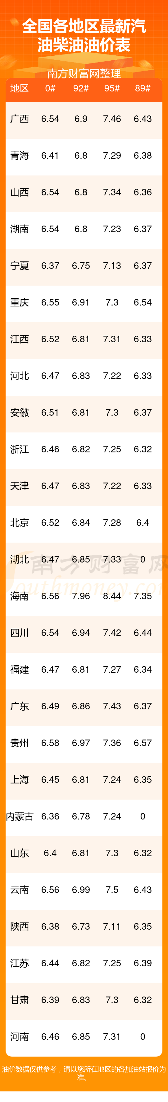 以上数据仅供参考,请以您所在地区的加油站实际售价为准。南方财富网发布此信息的目的在于传播更多信息,对使用该油价信息所导致的结果概不承担责任。