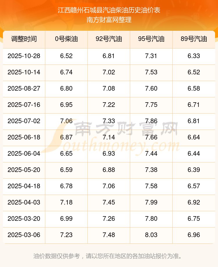 油价调整最新消息:下一轮油价调整时间11月10日24时。11月4日江西赣州石城县汽油、柴油每升的价格是多少?详情如下:95号汽油为7.31元,减了0.22元;92号汽油为6.81元,减了0.21元;89号汽油为6.33元,减了0.19元;0号柴油为6.52元,减了0.22元,调整时间为10月28日。
