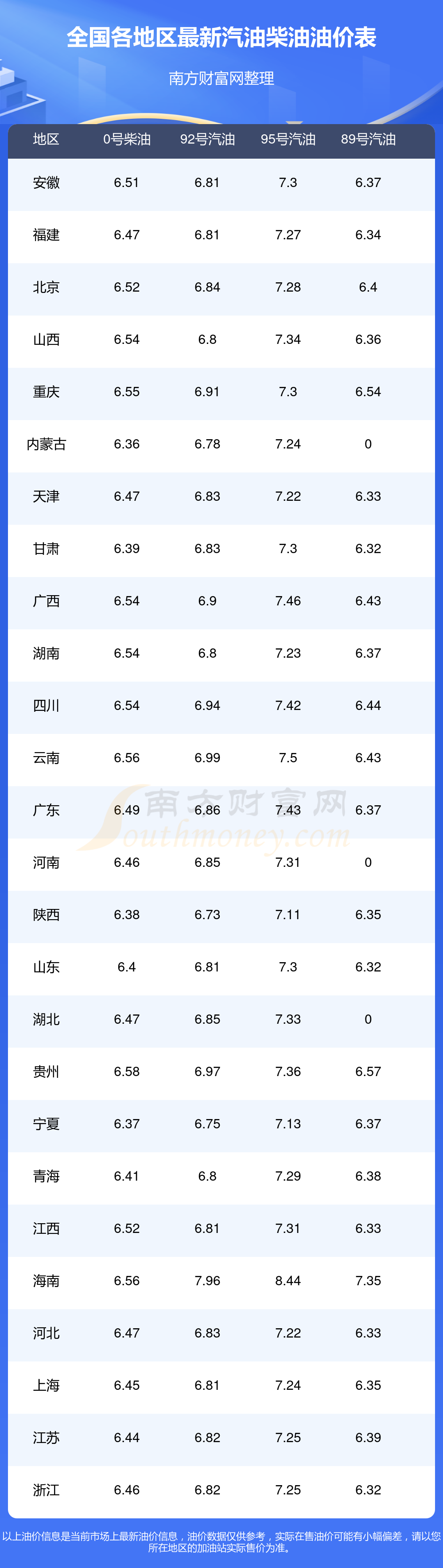 2025年11月4日全国各地油价调整及最新汽油价格表