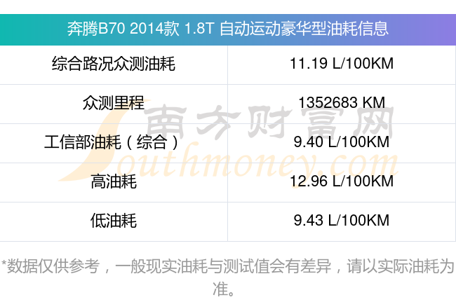 根据多位车主实测得出数据,该车型低油耗为9.43升/百公里,高油耗为12.96升/百公里,综合路况众测油耗为11.19升/百公里,工信部综合油耗为9.40升/百公里。