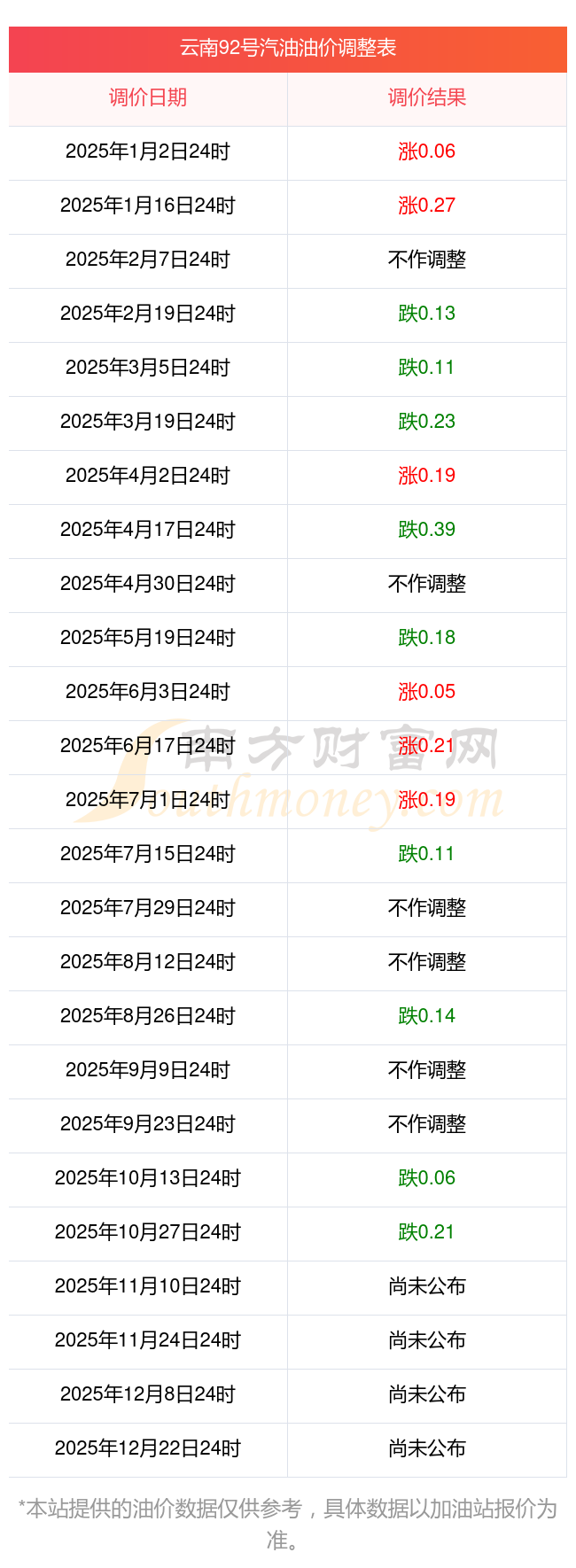 11月4日,云南92号汽油的价格是6.99元每升,本次的调整时间为10月28日,对比上次的调整减了0.21元,减2.917%,下次调整时间为11月10日24时,还有6.96天。