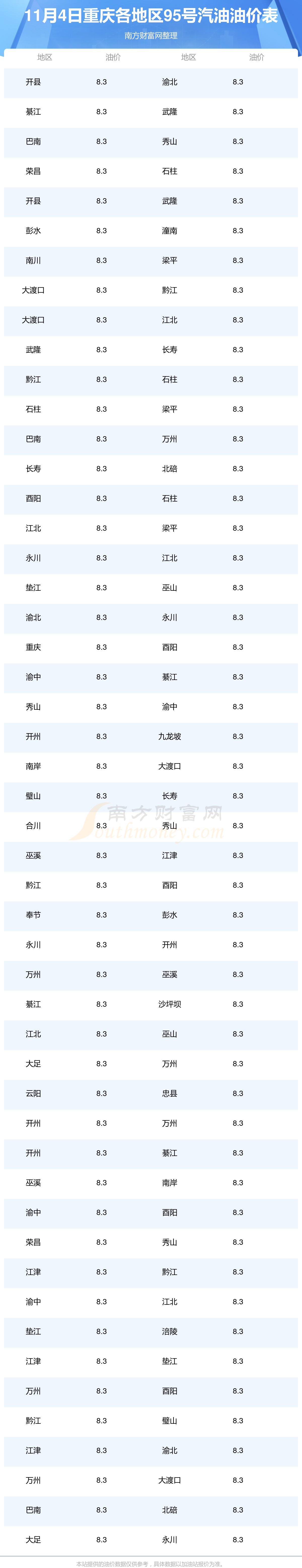 2025年11月4日重庆95号汽油最新价格一览表