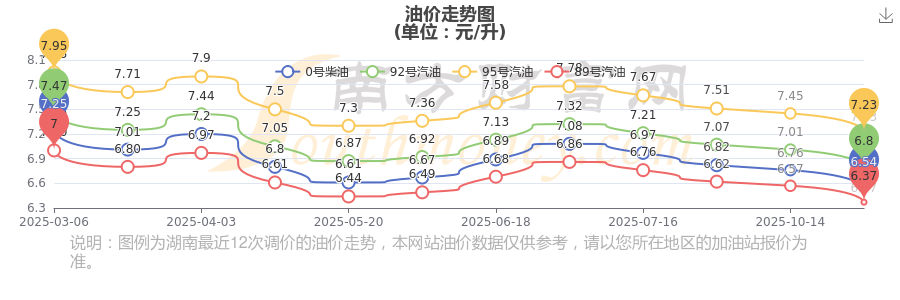 11月4日,常德汽油、柴油每升最新价格为(10月28日调整后的价格):92号汽油为6.8元,减了0.21元,减幅达3.01%;95号汽油为7.23元,减了0.22元,减幅达3.01%;89号汽油为6.37元,减了0.2元,减幅达3.01%;0号柴油为6.54元,减了0.22元,减幅达3.26%。