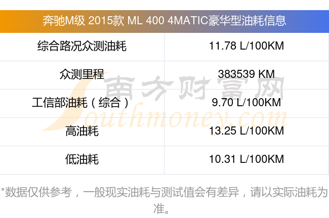 在动力上,奔驰M级 2015款 ML 400 4MATIC豪华型配备的是一台3.0T333马力V6双涡轮增压发动机,匹配的是7挡手自一体自动档变速箱,燃料形式为汽油,常规整备质量2227kg,厂家参考价99.8万元。