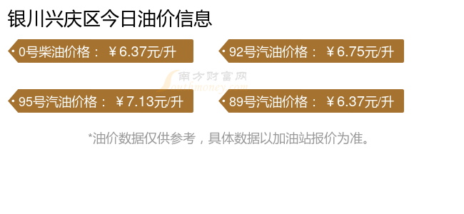 11月4日银川兴庆区汽油、柴油每升价格:距离最近的油价调整时间是10月28日,92号汽油为6.75元,下调了0.21元,下调幅达3.02%;95号汽油为7.13元,下调了0.22元,下调幅达2.99%;89号汽油为6.37元,下调了0.2元,下调幅达3.04%;0号柴油为6.37元,下调了0.22元,下调幅达3.34%。