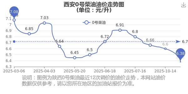 油价调整最新消息:西安汽油、柴油11月4日价格多少钱一升?具体为:0号柴油为6.38元,降了0.22元;95号汽油为7.11元;92号汽油为6.73元;89号汽油为6.35元,调整时间为10月28日。西安下一轮油价调整时间11月10日24时,距离现在还有6.96天。