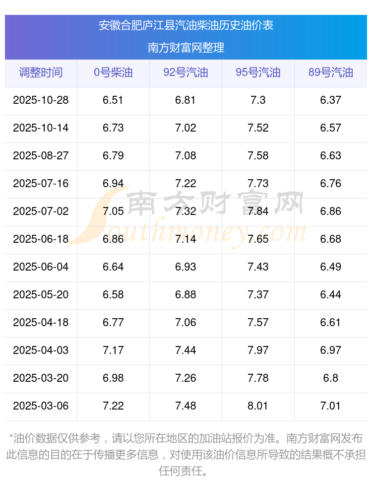 2025年安徽合肥庐江县汽油价格一览表
