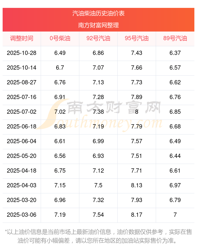 广东揭阳95号汽油11月4日的最新价格(10月28日油价调整后的价格):广东揭阳95号汽油7.43元/升,相对上次调整时间10月14日的油价7.66元每升,下调了0.23元,下调3.003%。下一轮油价调整时间11月10日24时,距离现在还有6.96天。
