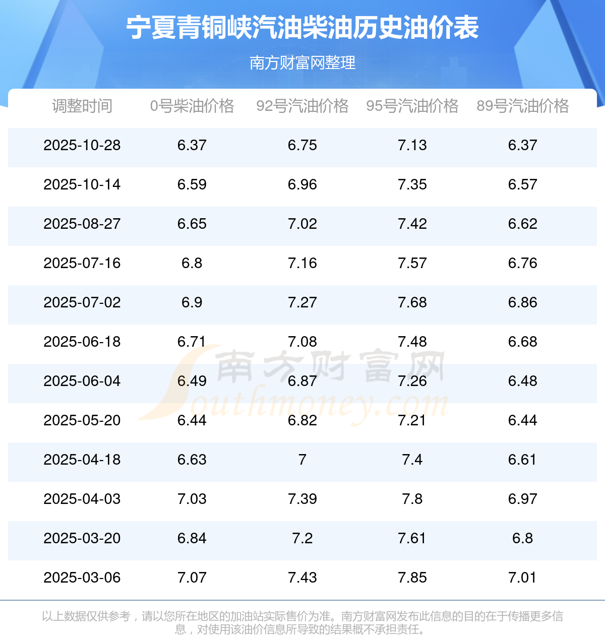 宁夏青铜峡汽油、柴油11月4日每升最新价格为:95号汽油为7.13元,下跌了0.22元;92号汽油为6.75元,下跌了0.21元;89号汽油为6.37元,下跌了0.2元;0号柴油为6.37元,下跌了0.22元,调整时间为10月28日。