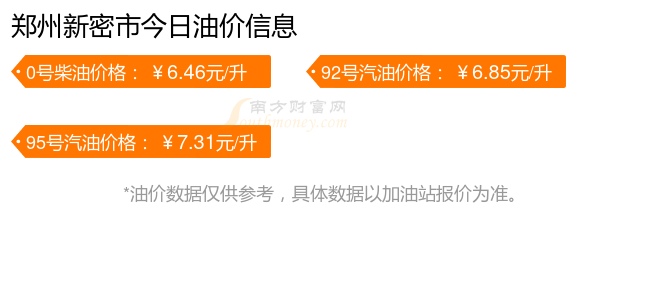 11月4日郑州新密市今日汽油价格如下:92号汽油6.85元;95号汽油7.31元;0号柴油6.46元(该价格为10月28日调整后的价格)。下一轮油价调整时间11月10日24时。