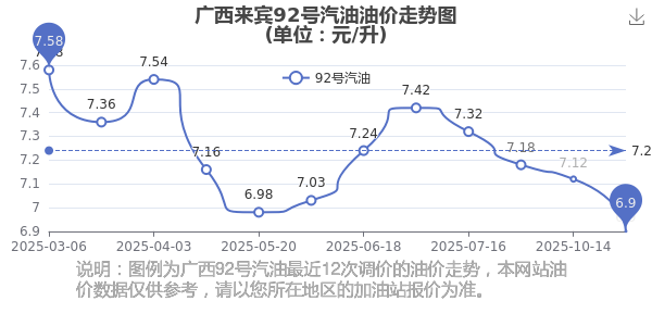 汽油、柴油11月4日每升最新价格:92号汽油为6.9元;95号汽油为7.46元;89号汽油为6.43元;0号柴油为6.54元,本轮油价调整时间为10月28日。下一轮油价调整时间11月10日24时,距离现在还有6.96天。