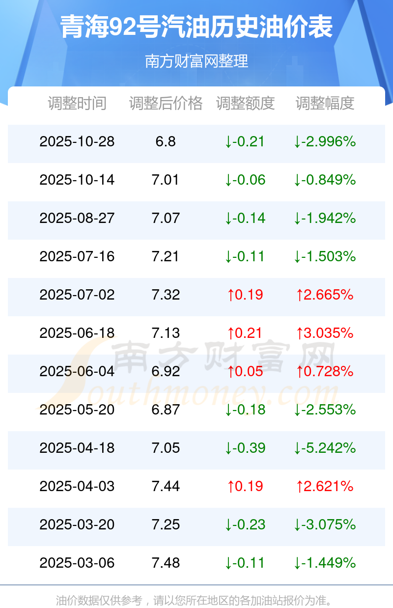 11月4日,青海92号汽油的价格是6.8元每升,本次的调整时间为10月28日,对比上次的调整降了0.21元,降2.996%,下次调整时间为11月10日24时,还有6.96天。